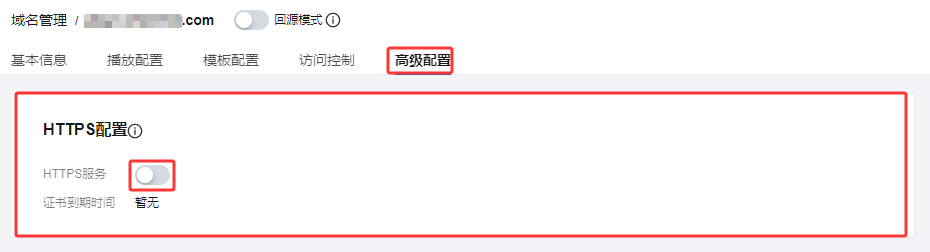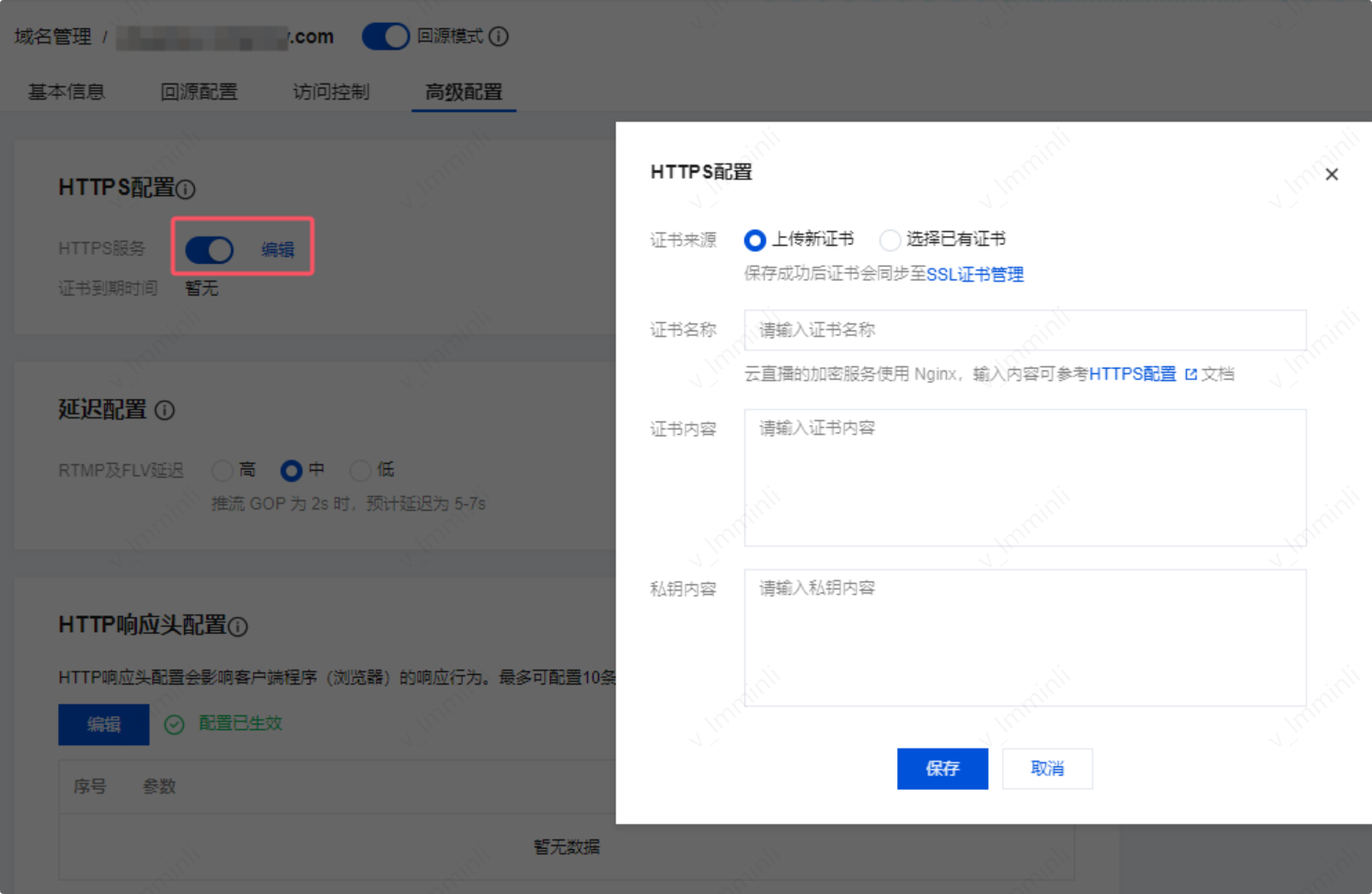 已开启 HTTPS 功能可修改配置。如果关闭此功能,将无法进行编辑。关闭此服务后,云直播将不再为该域名提供 HTTPS 服务。若证书已过期,需更新为新的有效证书。