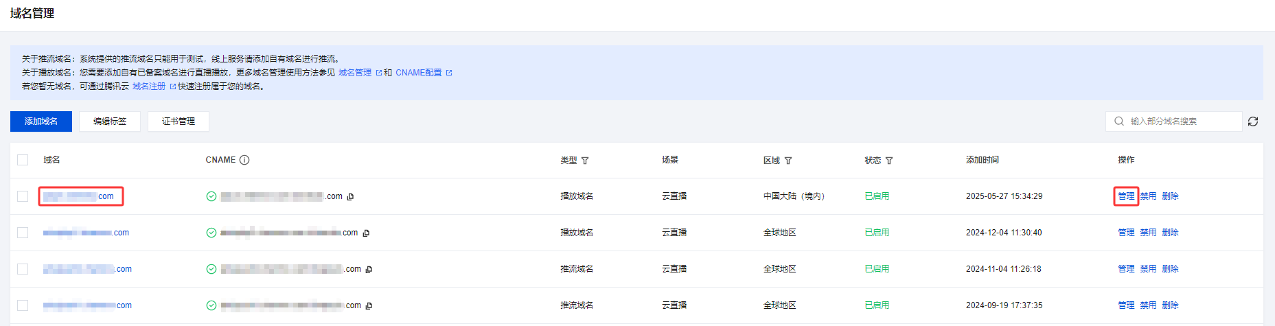 1. 进入 域名管理,单击需配置的播放域名或右侧的管理进入域名详情页。