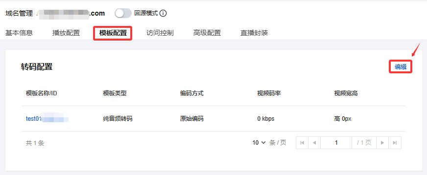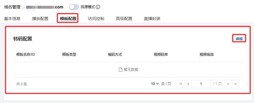 2. 选择模板配置 > 转码配置,单击转码配置标签右上角的编辑。