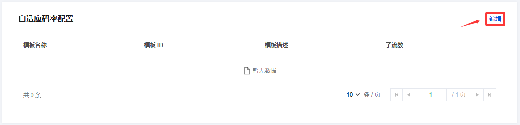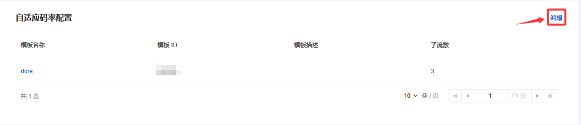 2. 选择模板配置 > 自适应码率配置,单击自适应码率配置标签右上角的编辑。