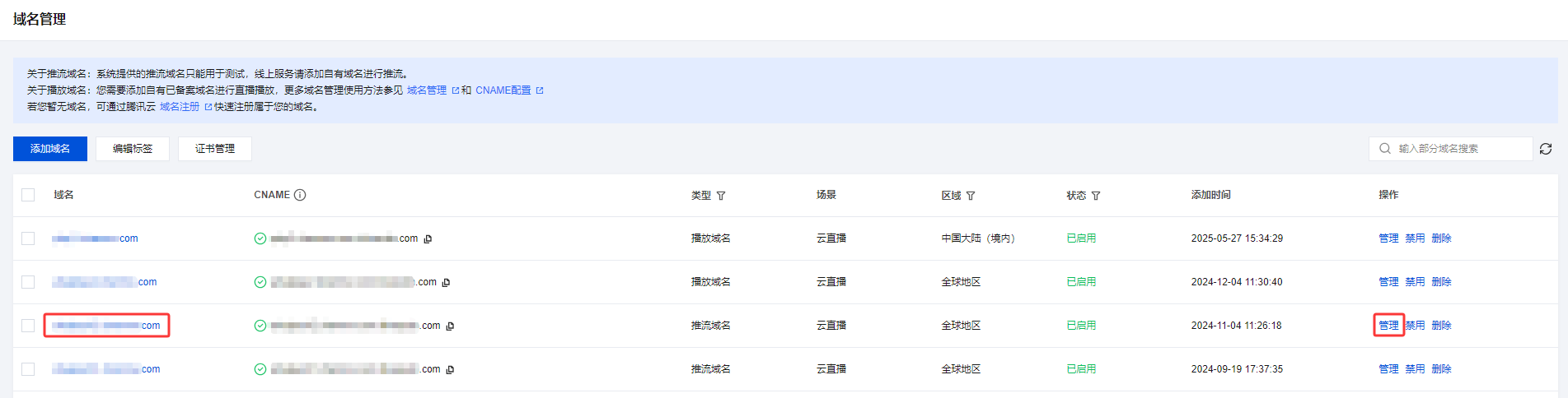 1. 进入域名管理,单击需配置的推流域名或管理进入域名详情页。