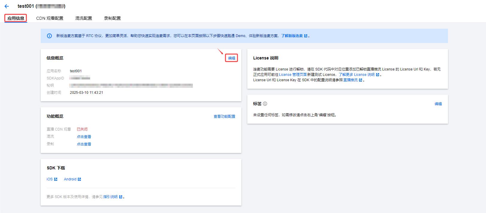 进入应用信息页面,您可查看应用的全量信息,包括信息概览、CDN 功能配置情况、SDK 下载链接、License 解锁说明以及标签信息。单击信息概览右上角的编辑,可修改应用名称。
