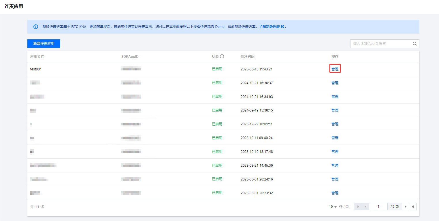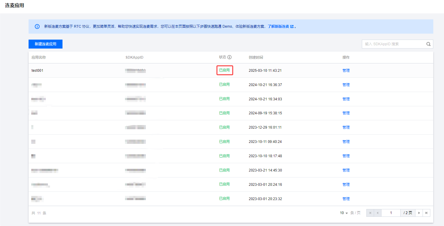 4. 应用列表展示所有 TRTC 应用的基本信息,已启用状态的 TRTC 应用即可用于体验新版连麦方案。