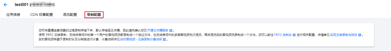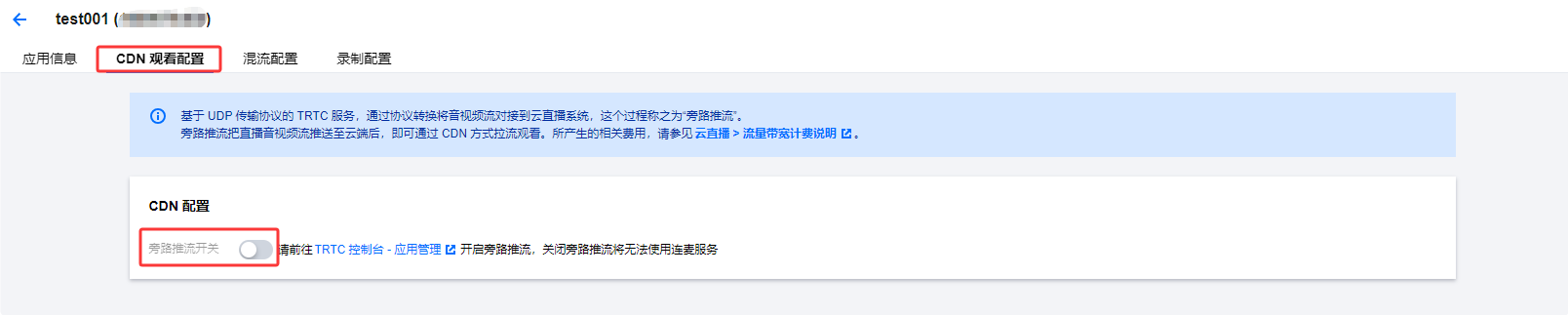新版连麦方案使用 TRTC 协议推流,开启旁路推流后,在观众端通过 CDN 拉流观看。在 CDN 观看配置页可查看当前应用是否开启旁路推流开关,可前往 TRTC 控制台 - 应用管理 开启旁路推流开关。