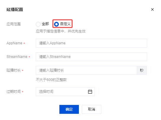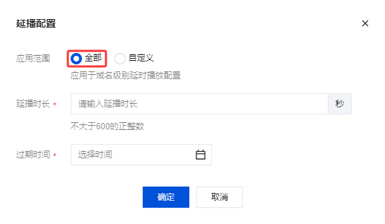 应用范围 | 单击选择配置全部或自定义: 全部:选择全部时,应用于域名级别延时播放配置。 自定义:选择自定义时,应用于指定信息中,相比:全部优先生效。 |