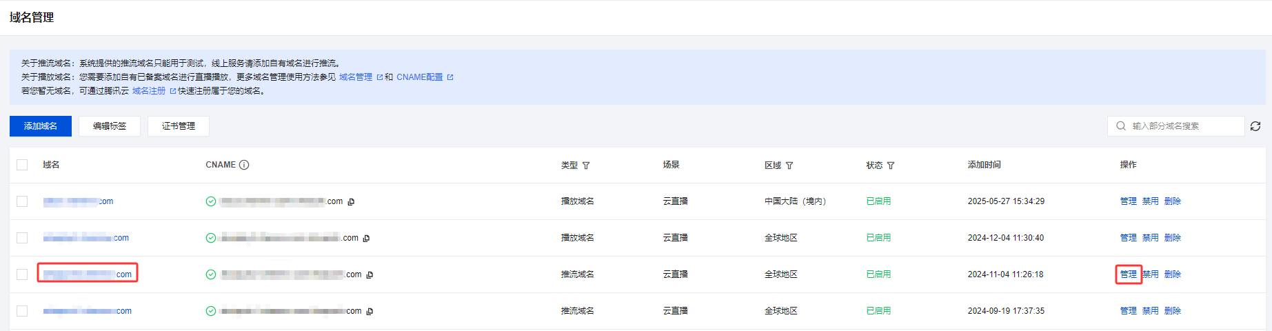 1. 选择 域名管理,单击需关闭延播配置的推流域名或右侧的管理,进入域名管理页。