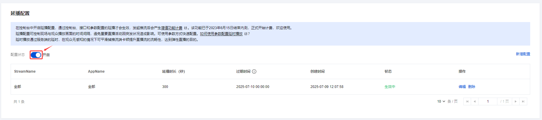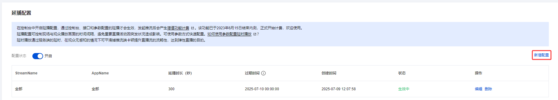 过期时间 | 延播配置最长支持生效7天。 |
