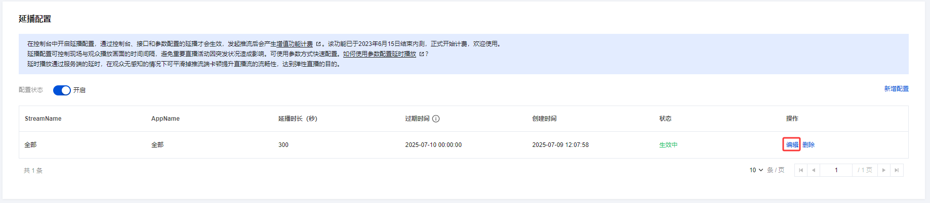 2. 在高级配置 > 延播配置中,单击右上角的编辑进入延播配置页。