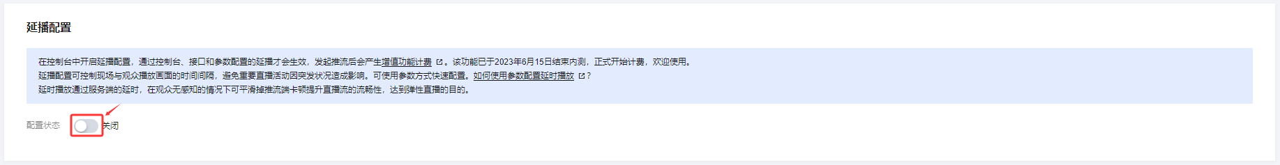 延时播放为计费增值服务,开启延播功能开关,通过使用控制台设置、调用延时直播接口或者推流域名携带延播参数配置,并成功推流后,将产生增值功能计费。