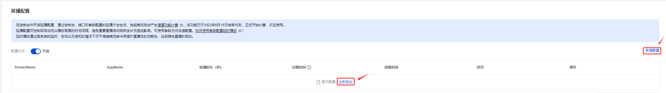 2.2 开启延播后,单击新增配置或者立即添加。