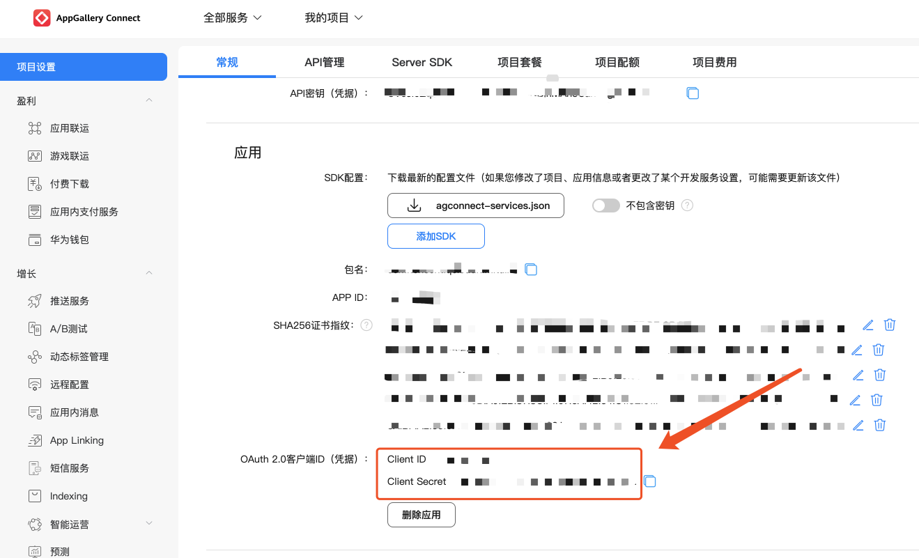 常规页面包含项目和应用的 Client ID 和 Client Secret,两者对应的参数不一致,请下拉至页面底部,获取应用的 Client ID 和 Client Secret。