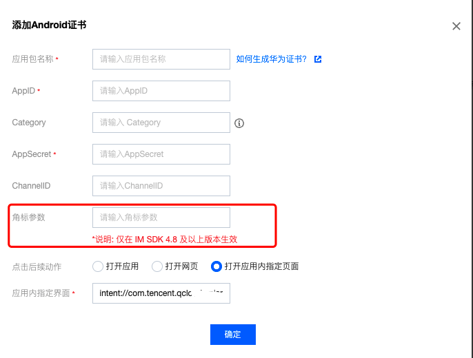 2. 在华为设备上实现角标功能时,需要在 IM 控制台额外配置角标参数。该参数需指定应用的主入口 Activity 类路径,格式为:[应用包名].ui.MainActivity。以包名com.tencent.weauth为例,对应的角标参数应配置为:com.tencent.weauth.ui.MainActivity。