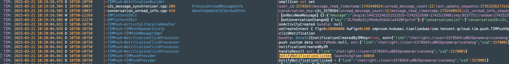 Flutter tencent_cloud_chat_push 推送插件接入,点击推送通知,不触发 “onNotificationClicked” 回调,日志如下: