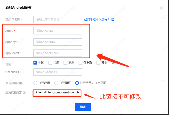 ![]() | 注意: 应用内指定界面链接,不可以修改。 该配置用于派发单击后离线推送插件的事件监听,不可以直接配置应用内页面的跳转。 ![]() |