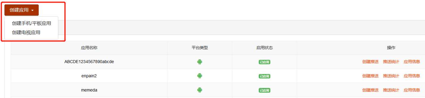 1. 如果您想使用的应用不在应用列表内,点击创建应用,选择创建手机/平板应用或电视应用。