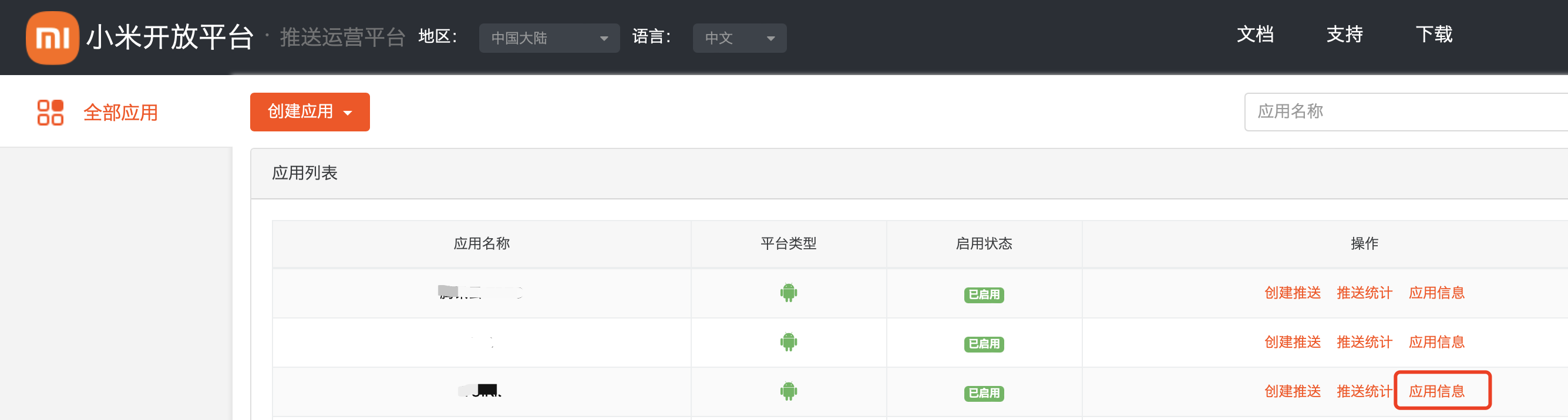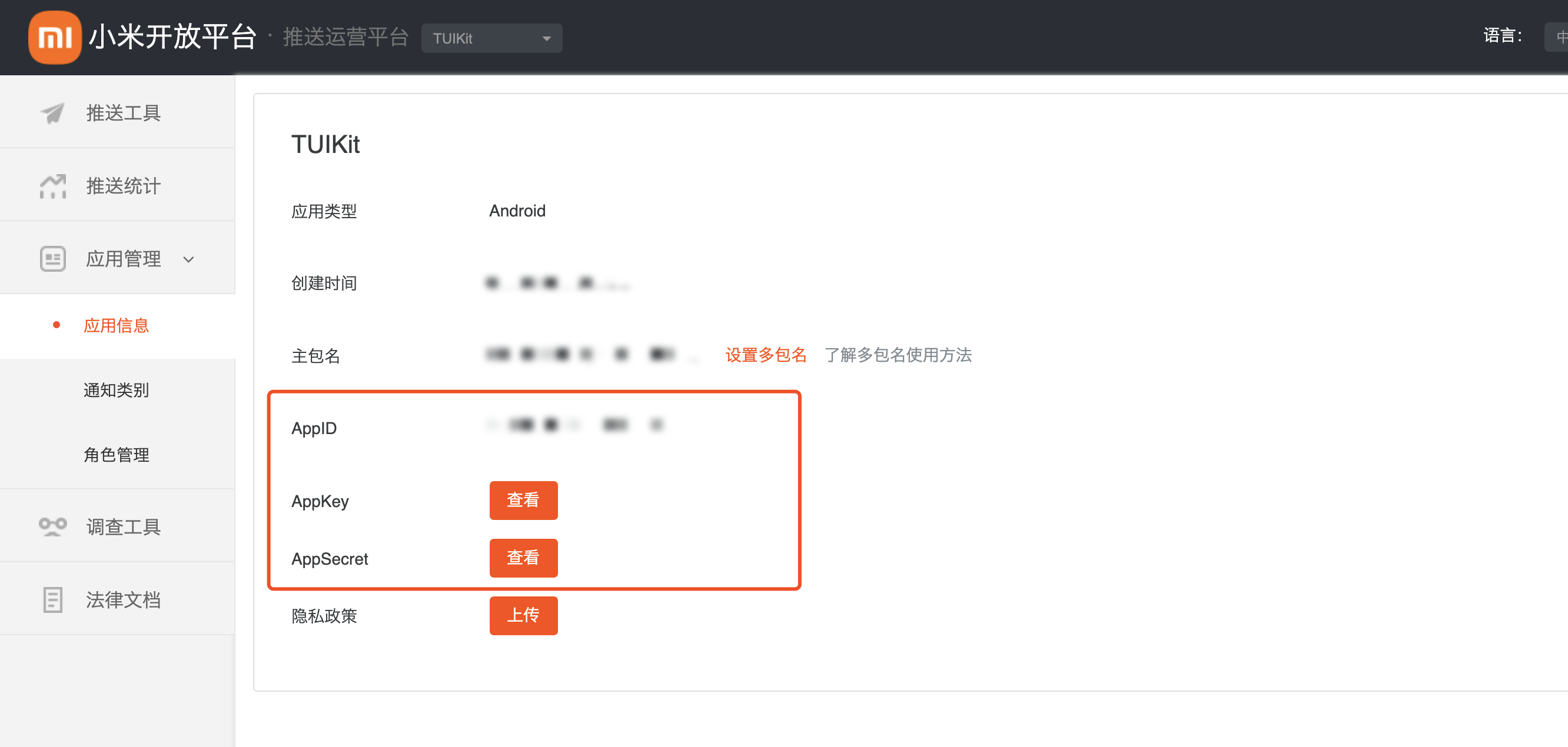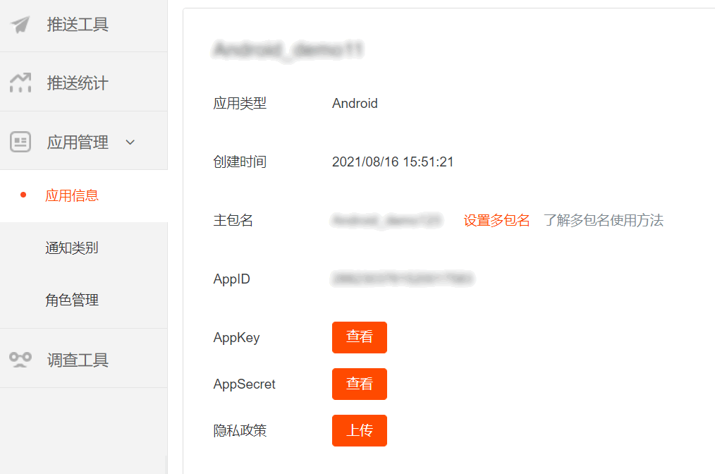 进入推送运营平台,单击应用管理 > 应用信息,获取应用信息。