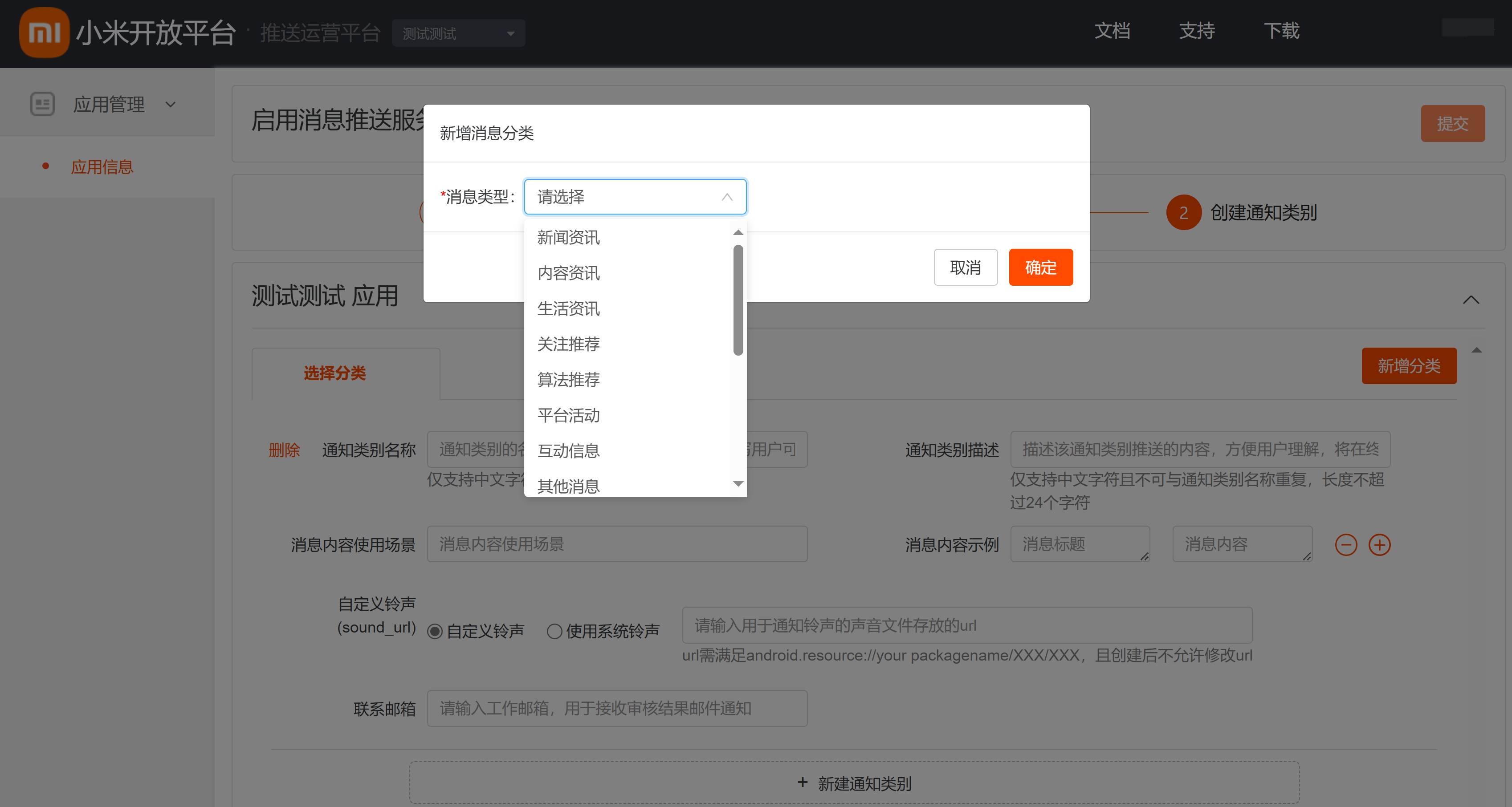 2.1 点击选择分类,详细的消息分类描述参考《小米推送消息分类新规》。