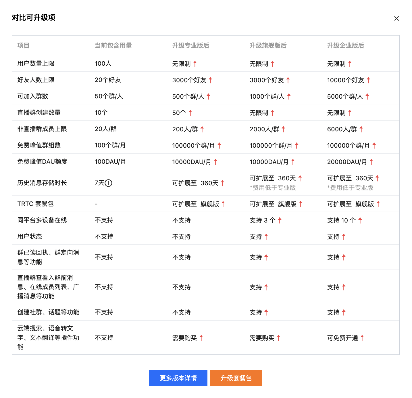 2. 单击弹窗的版本对比,在弹出的新窗口中查看当前版本和更高版本详细能力对比,单击底部的升级套餐包,即可进入即时通信 IM 购买页,执行步骤2进行购买。