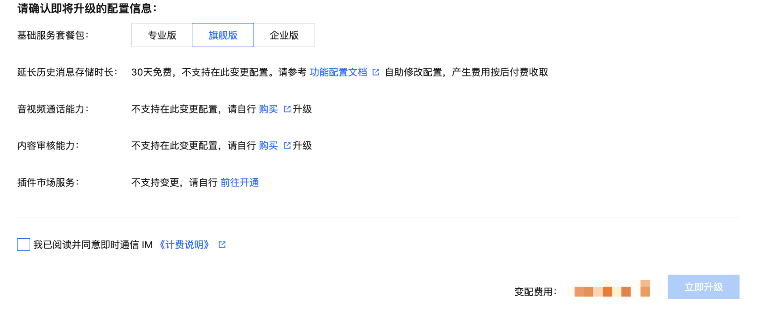 即时通信 IM 专业版应用,可以通过购买基础服务套餐包的方式升级至旗舰版、企业版。请参照以下说明操作。