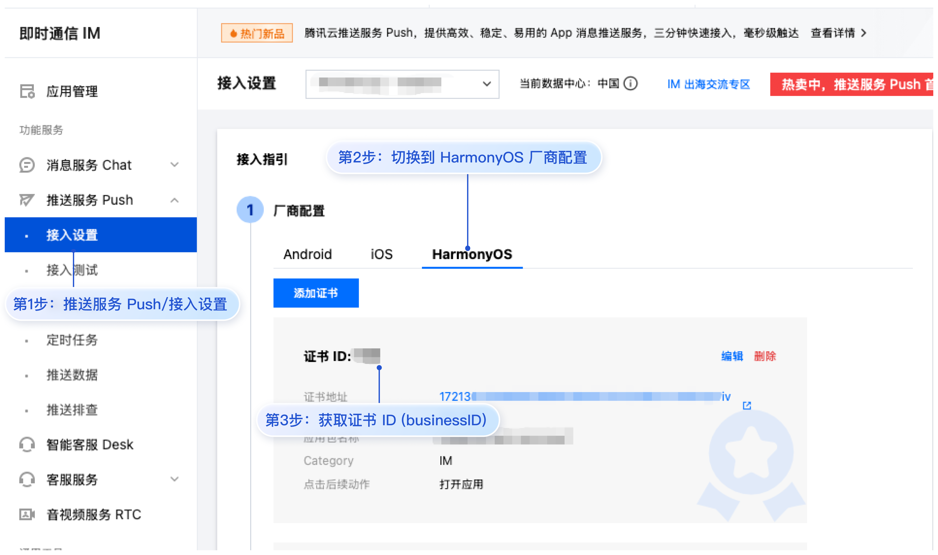 1. 在 IM 控制台 > 推送服务 Push > 接入设置 获取的证书 ID。