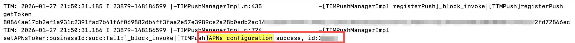 运行 App,过滤 “TIMPush” 关键字,查看相关日志: