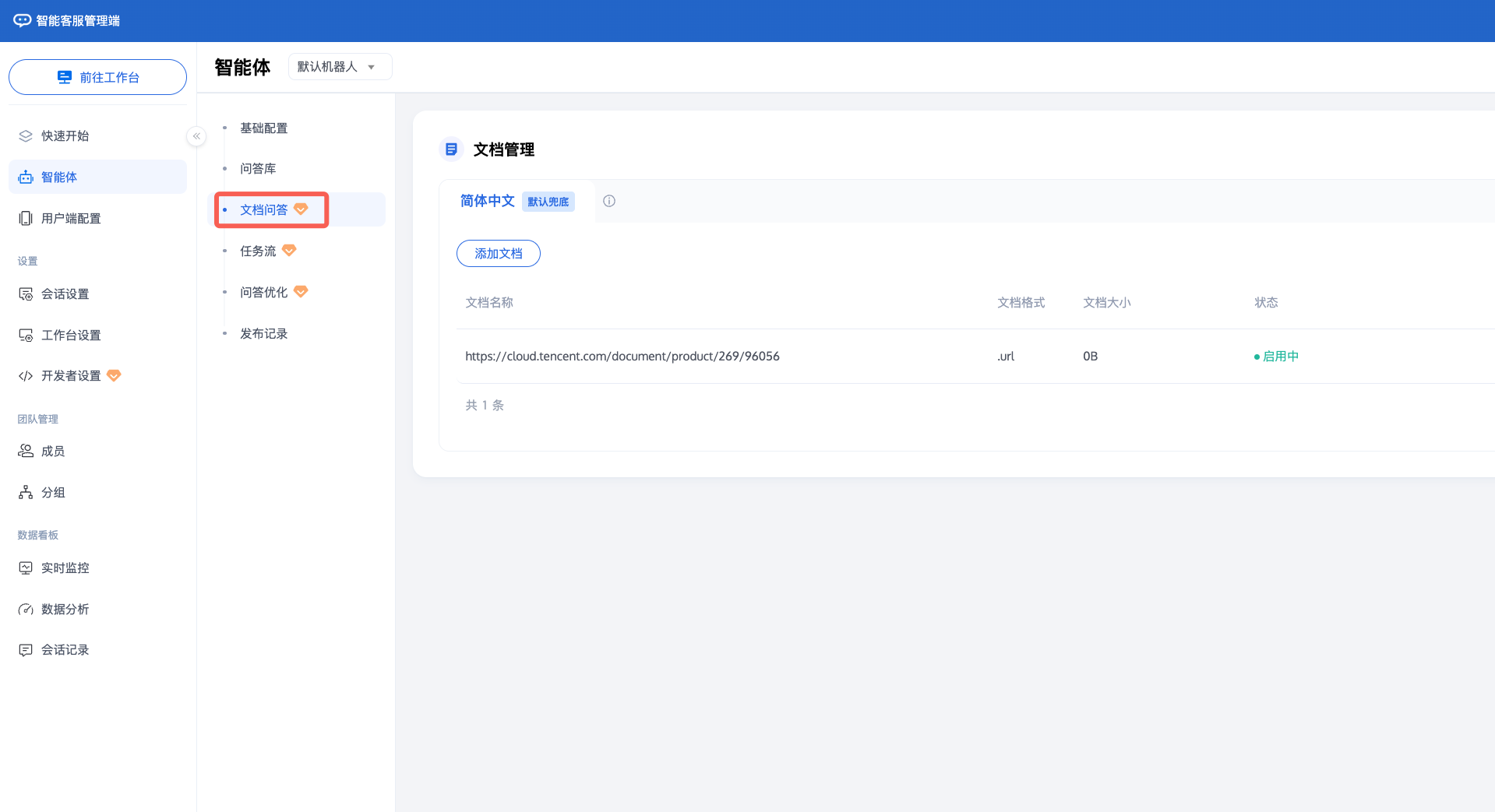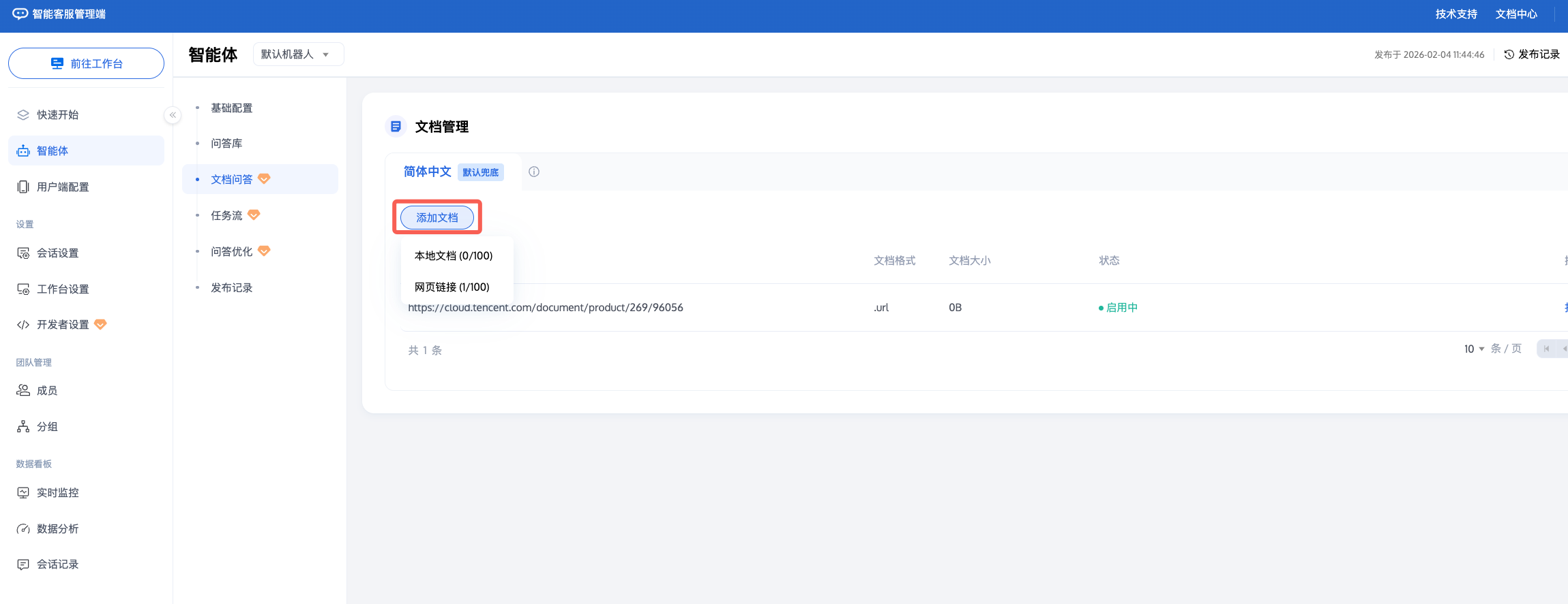 支持上传文档形式的企业知识。当用户提问时,智能体机器人将结合文档内容生成回答。该功能融合 OCR、版面分析、目录解析,精准解析文档内容;生成回复时,使用了大语言模型,回答更准确。