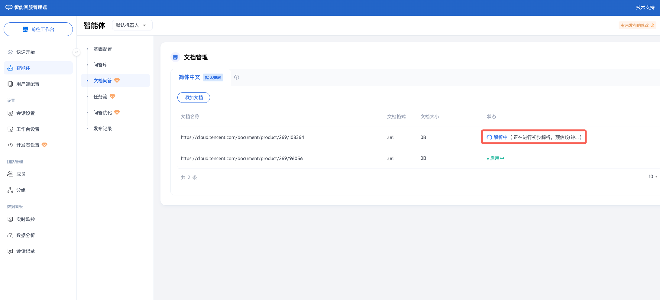 3. 文档上传后,将自动解析文档内容。解析过程持续几分钟,请耐心等待。解析完成后,您可以 测试发布 文档问答功能。