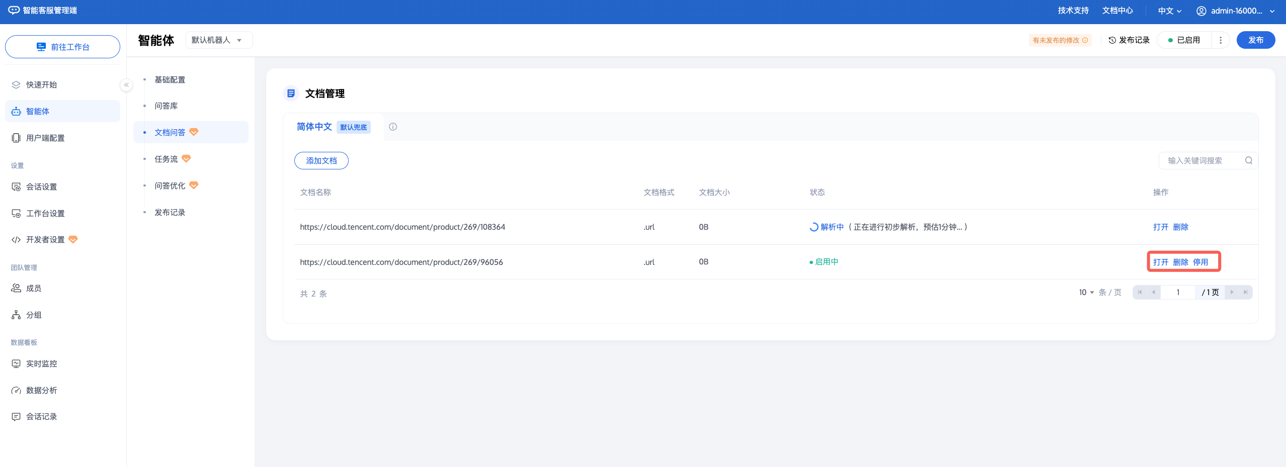 文档上传后,您可以在右侧的操作区域,对文档进行下载/删除/停用/启用操作。