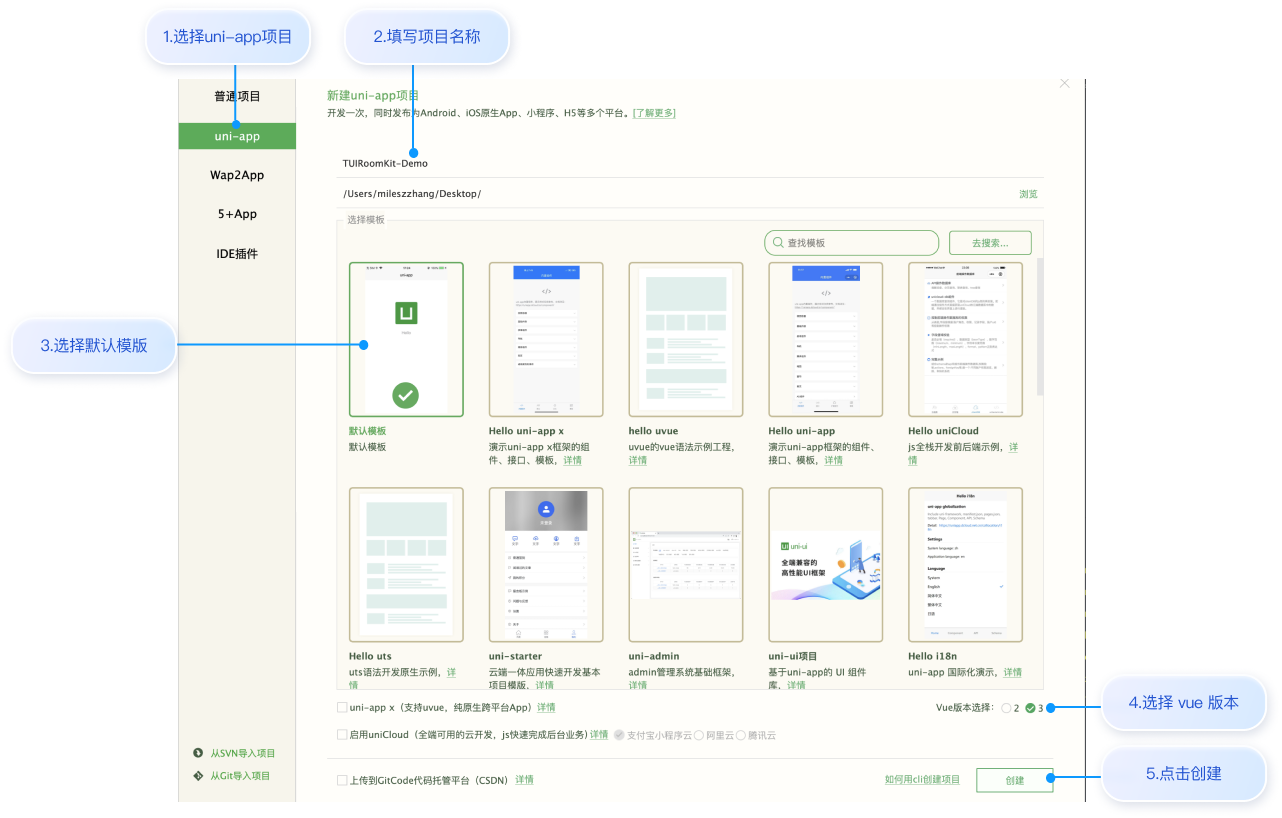 打开 Hbuilderx 开发工具,点击新建 uni-app 项目:项目名称 (TUIRoomKit-Demo)。