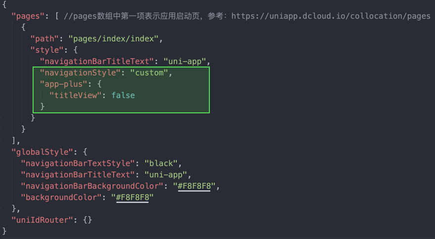 中新增如下配置。 "navigationStyle": "custom","app-plus": {"titleNView": false}