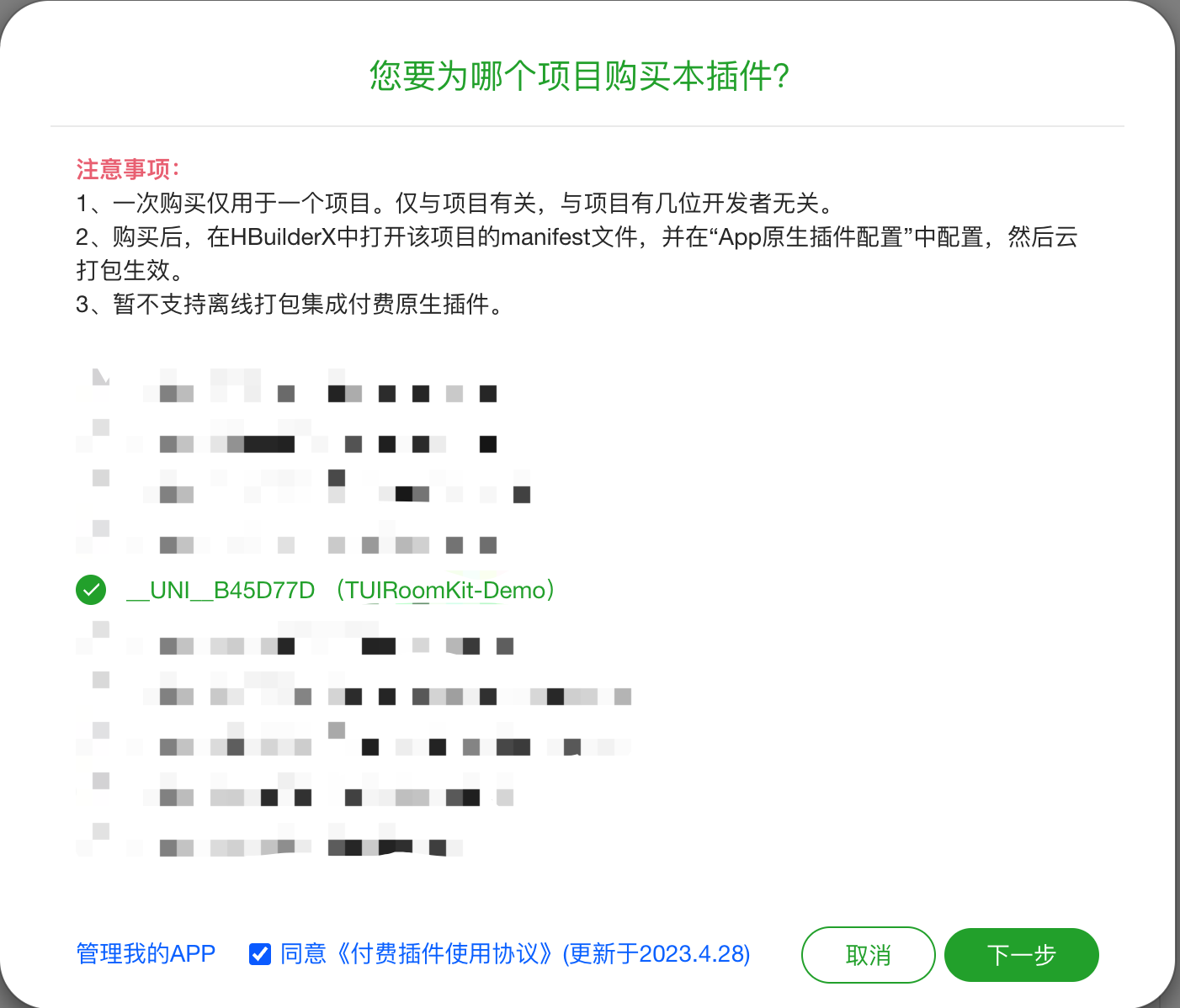 1. 访问 TencentCloud-TUIRoomEngine 插件,在插件详情页中购买插件,购买插件时选择对应的 AppID,绑定正确的包名。