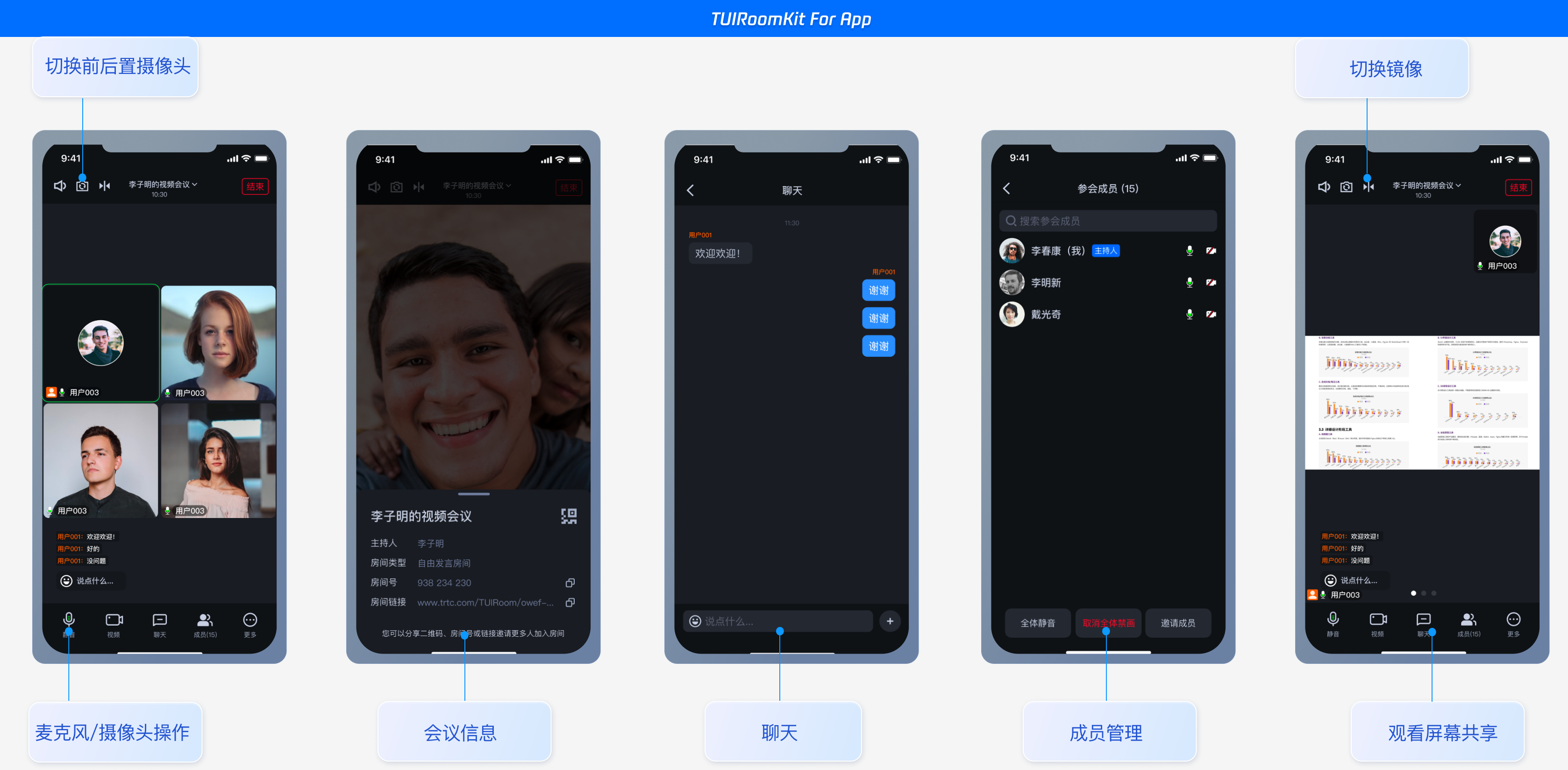 TUIRoomKit 是腾讯云推出的多人音视频 UI 组件。组件提供房间管理、音视频控制、屏幕共享、成员管理、麦位管理、即时聊天、自定义布局切换等丰富的功能交互。同时支持中英文切换,一键换肤等能力。