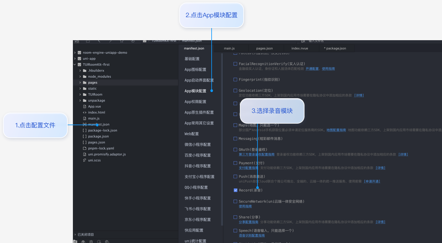 安卓需要使用到麦克风权限,所以需要在 App 模块配置中添加录音模块。