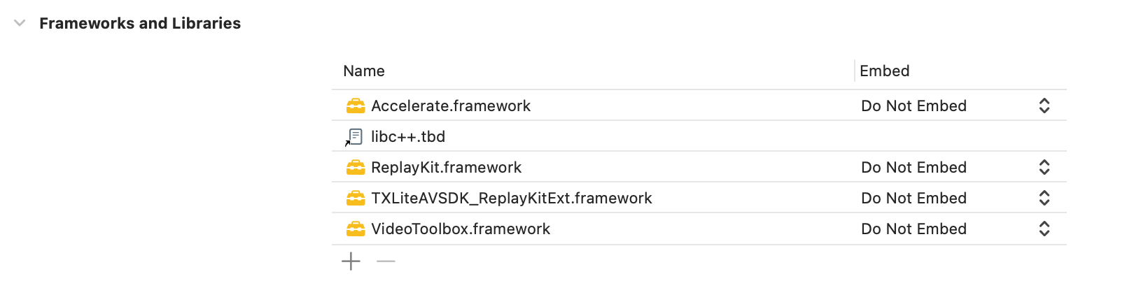 3. 将下载到的 SDK 压缩包中的 TXLiteAVSDK_ReplayKitExt.framework 拖动到工程中,勾选刚创建的 Target。