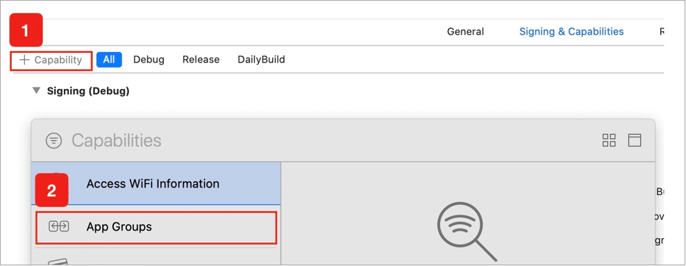 4. 如果选择执行步骤1,需要在新增加的 Target 中,依次单击 + Capability,双击 App Groups,如下图: