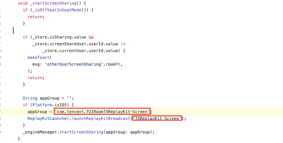 步骤3:在组件中使用您的 App Group 和 BroadCast Upload Extension name 替换我们应用的 App Group 和 BroadCast Upload Extension name ,代码位置请点击 文件链接。