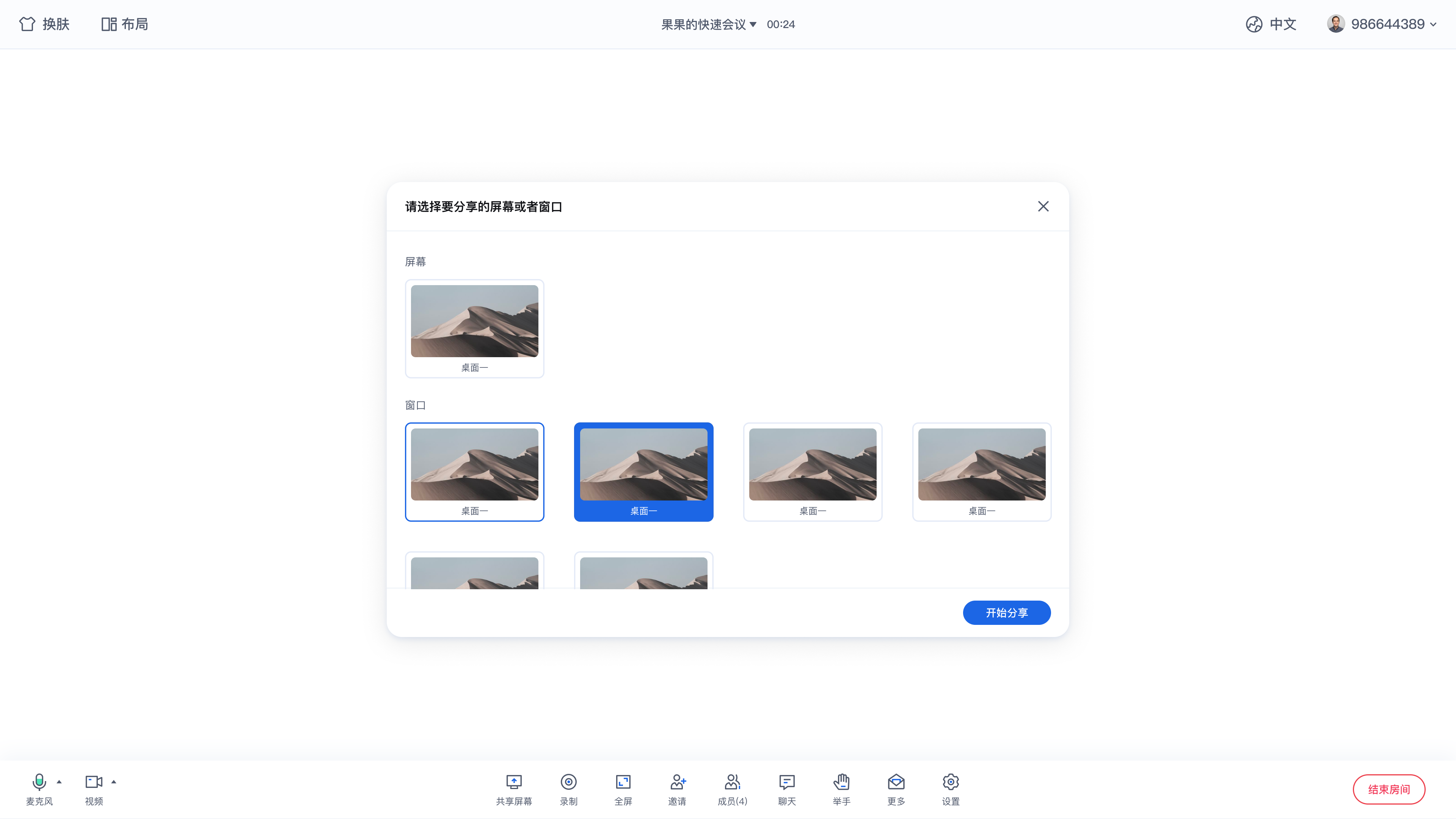端用户进入房间后,通过点击底部工具栏共享按钮,可以实现屏幕共享操作。共享屏幕选择窗口或屏幕 | 共享屏幕中 |