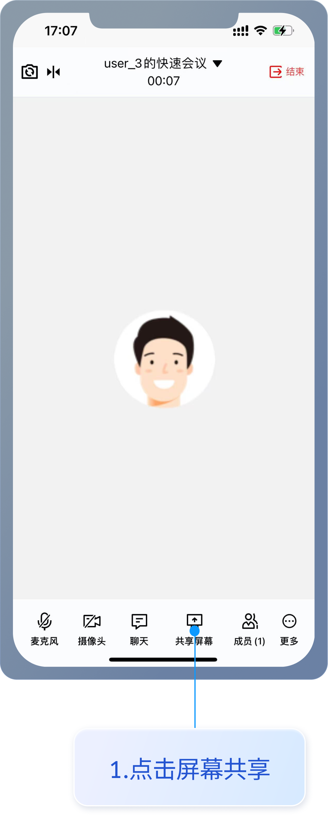 用户进入房间后,通过点击底部工具栏共享按钮,可以实现屏幕共享操作。