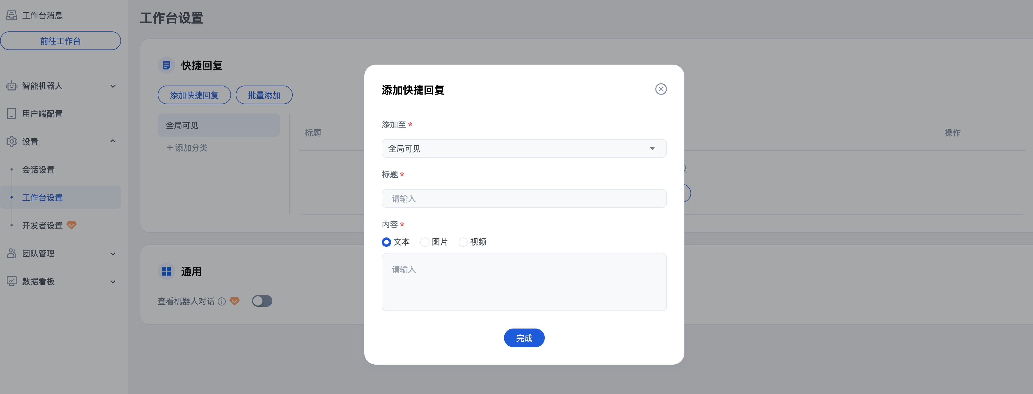 管理员可以在此页面为全部成员、指定分组、指定成员配置快捷回复。成员也可以在工作台配置个人可见的快捷回复。