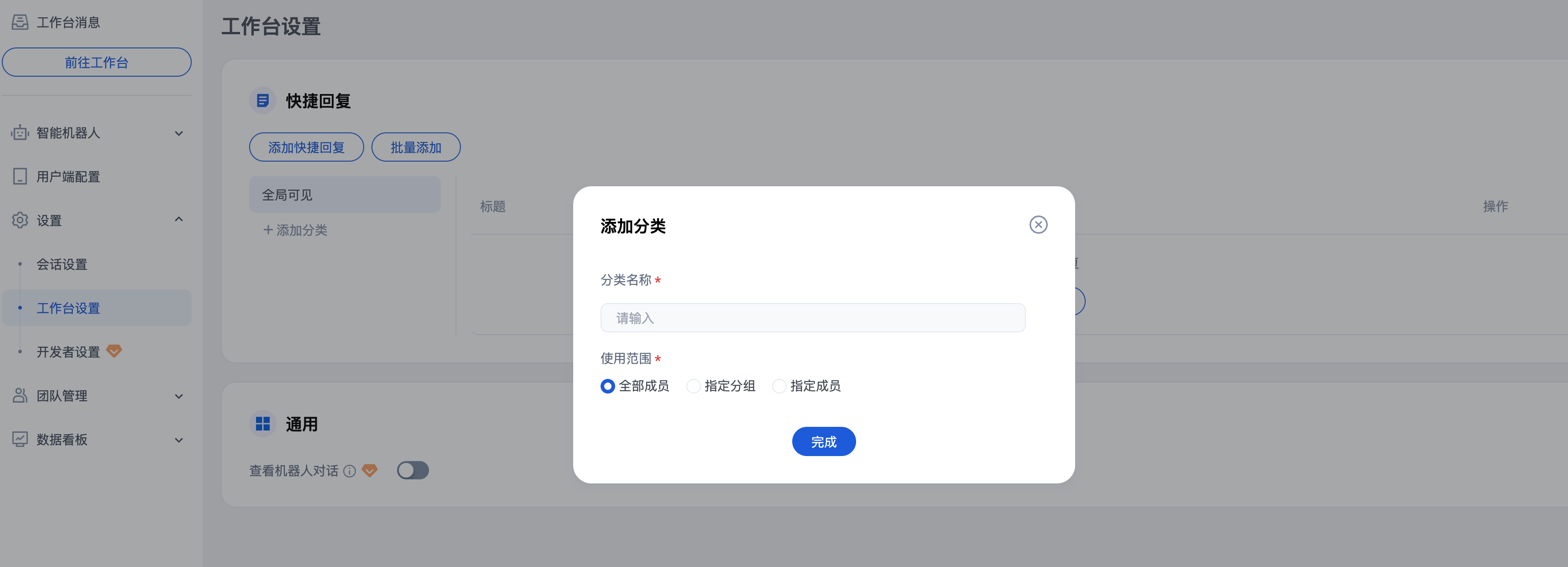 在快捷回复卡片,单击分类下方的添加分类,您可以在此处设置分类的名称及使用范围。