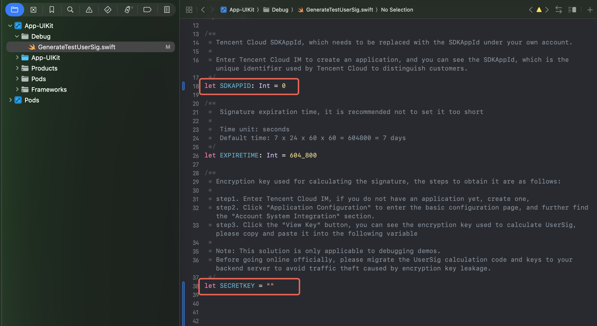 1. 配置 SDKAppID 和 SDKSecretKey:在 App-UIKit.xcworkspace 工程中,将获取的 SDKAppID 和 SDKSecretKey 填入