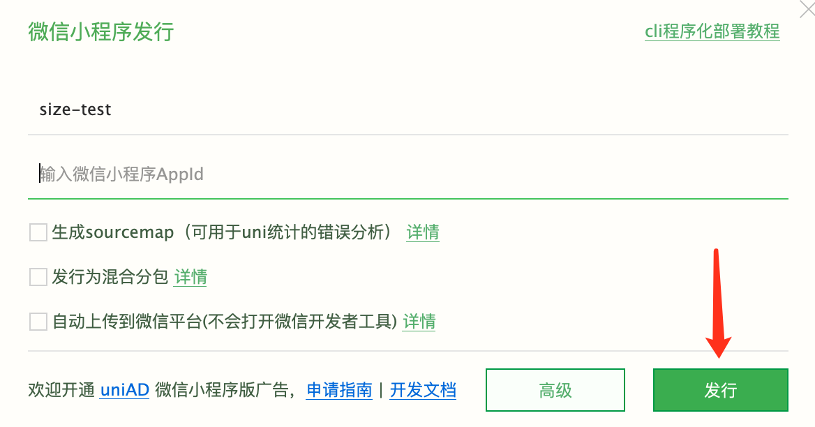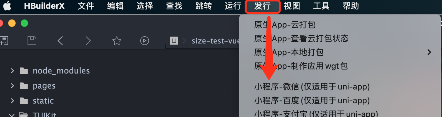 小程序发布前使用 HBuilderX 的发行功能进行打包。使用发行方式进行打包会删除代码中的 Source Map 等信息,打包体积最小。在 HBuilderX 的工具栏中依次单击发行 > 小程序-微信(仅适用于 uni-app)。