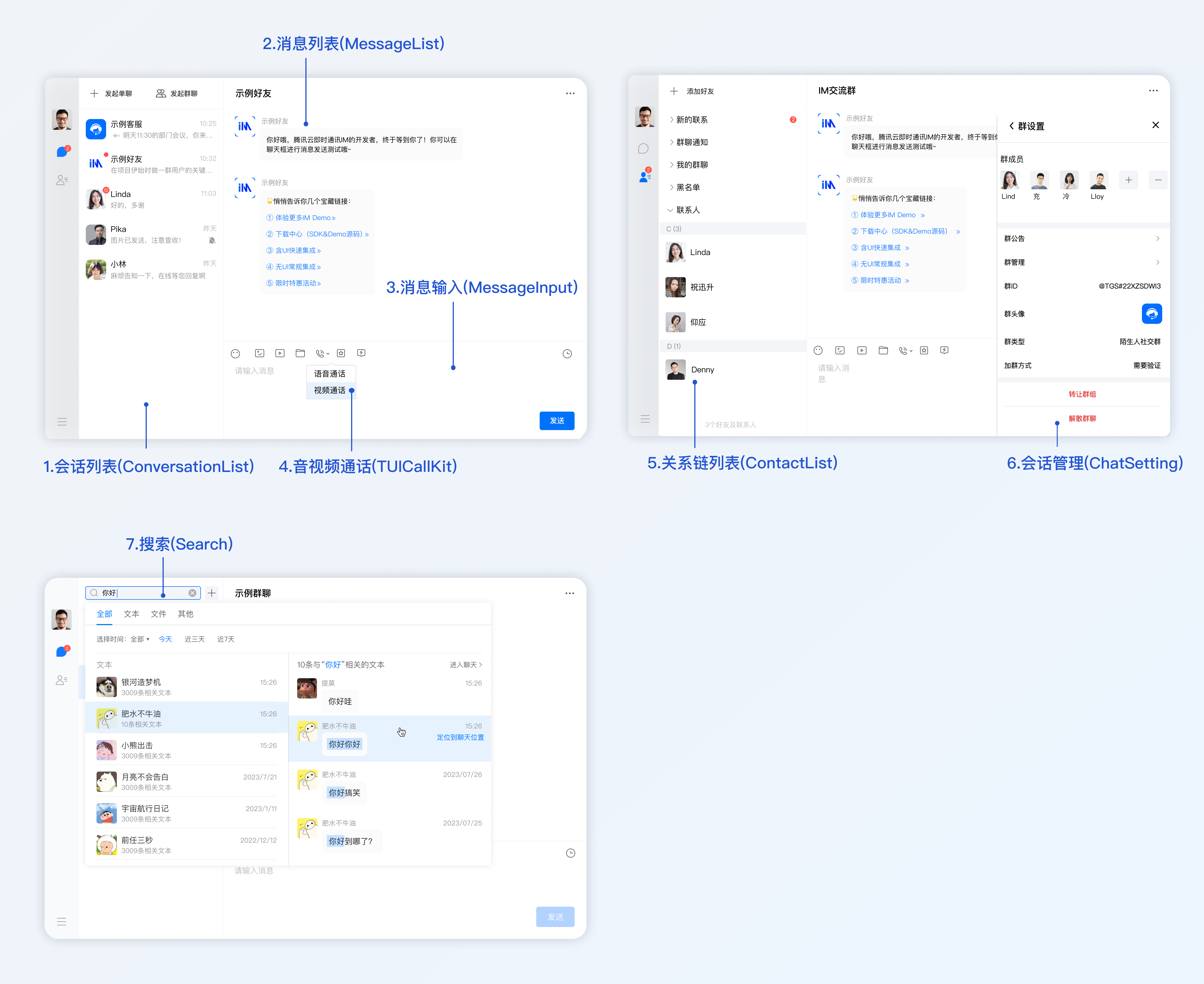 chat-uikit-vue3 是基于腾讯云 Chat SDK 的一款 vue3 UI 组件库,它提供了一些通用的 UI 组件,包含会话、聊天、群组等功能。基于这些精心设计的 UI 组件,您可以快速构建优雅的、可靠的、可扩展的 Chat 应用。 chat-uikit-vue3 界面效果如下图所示: