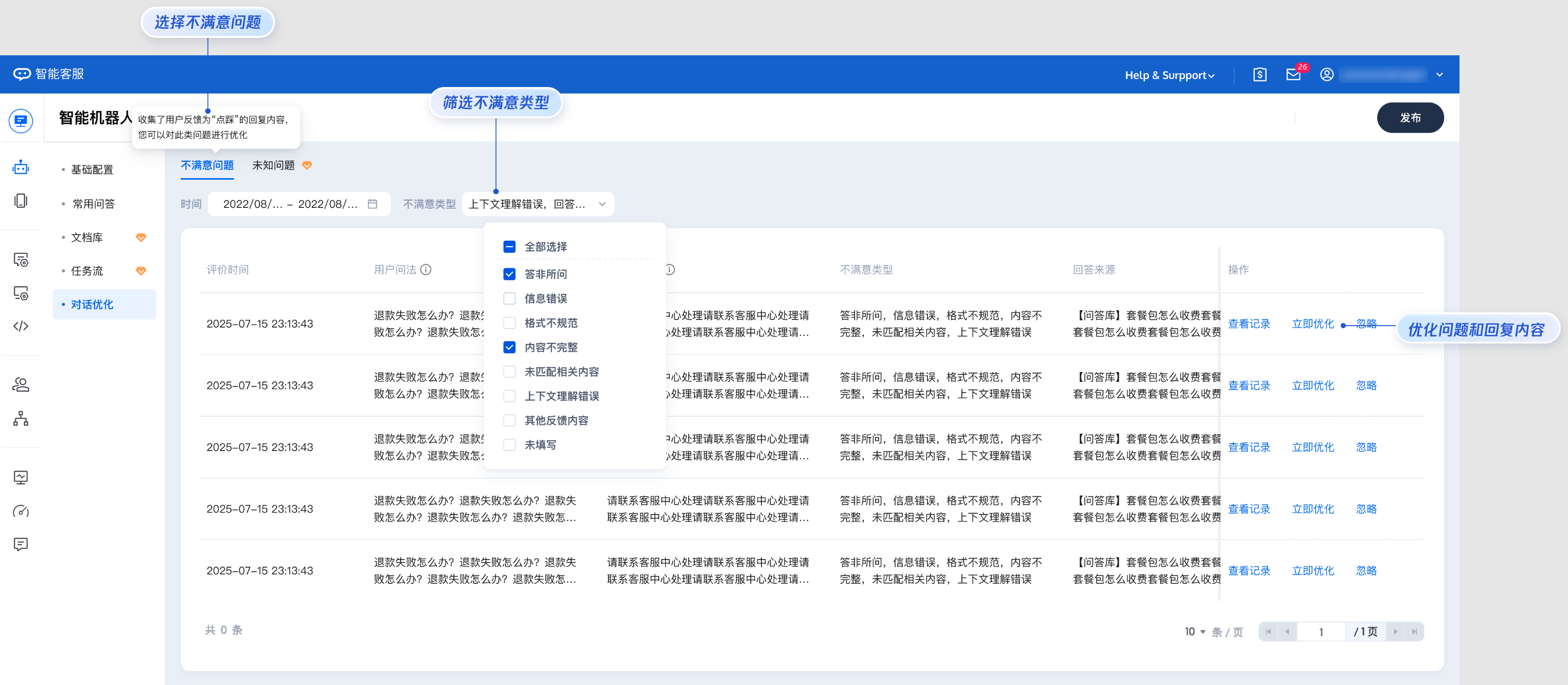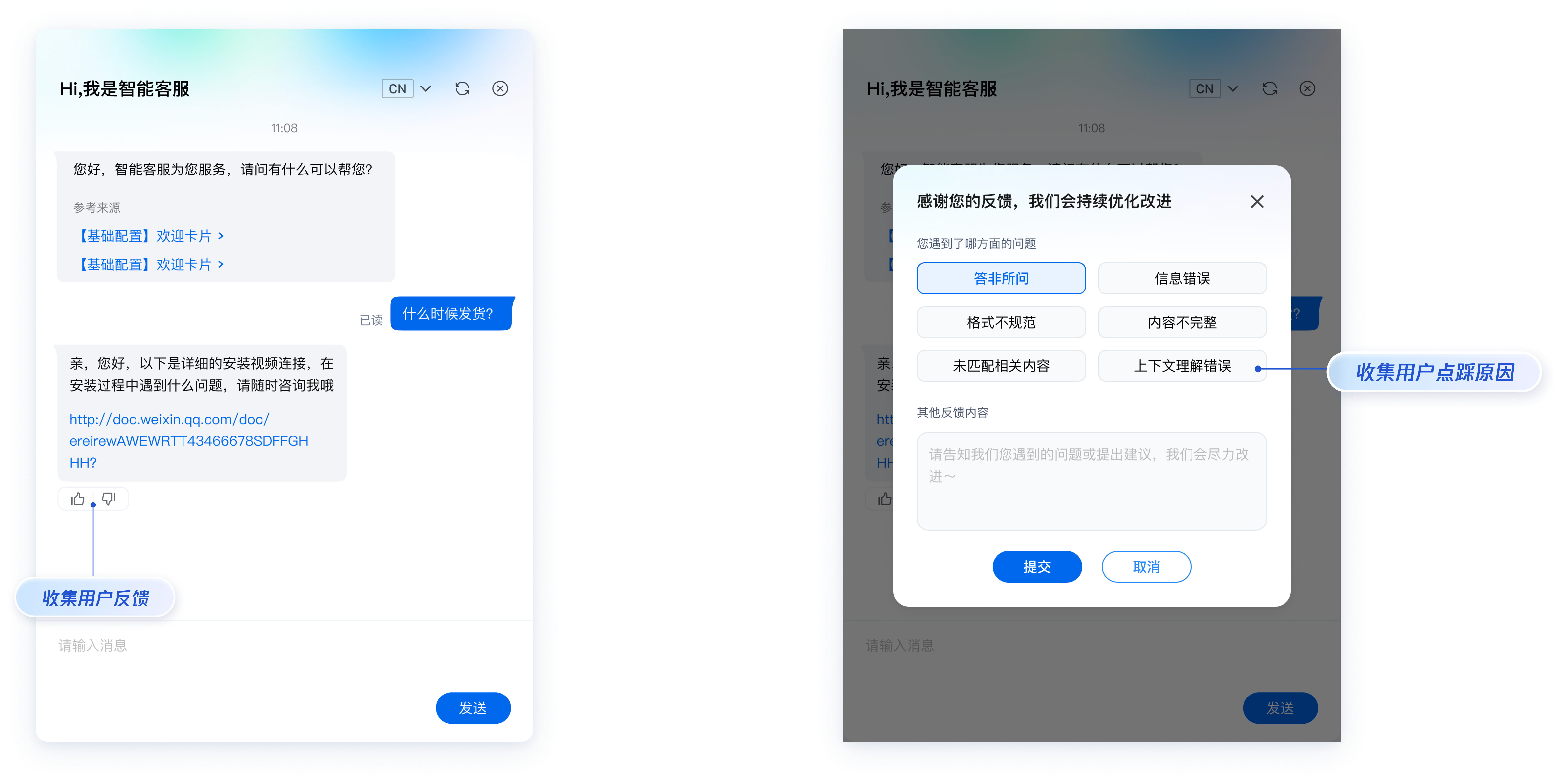 管理端:系统将自动收集用户点踩的问题,便于人工跟进确认和持续优化。