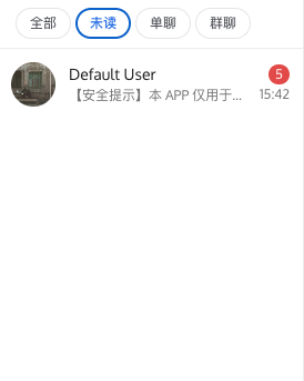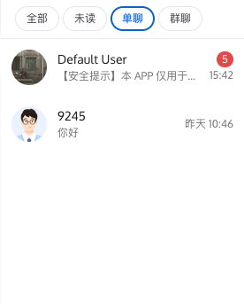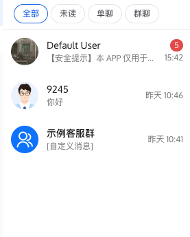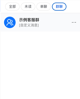 按照全部会话、未读会话、单聊会话、群会话四个维度进行区分,通过点击不同分组按钮执行不同的筛选规则。