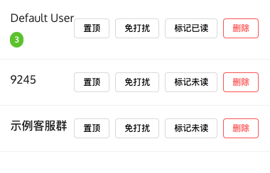 <template><div class="conversation-with-actions"><divv-for="conversation in conversationList":key="conversation.conversationID"class="conversation-item"><div class="conversation-info"><div class="name">{{ conversation.getShowName() }}</div><div class="status"><span v-if="conversation.isPinned" class="pin-badge">📌 置顶</span><span v-if="conversation.isMuted" class="mute-badge">🔕 免打扰</span><span v-if="conversation.unreadCount > 0" class="unread-badge">{{ conversation.unreadCount }}</span></div></div><div class="conversation-actions"><button@click="handlePin(conversation.conversationID, !conversation.isPinned)":class="{ active: conversation.isPinned }">{{ conversation.isPinned ? '取消置顶' : '置顶' }}</button><button@click="handleMute(conversation.conversationID, !conversation.isMuted)":class="{ active: conversation.isMuted }">{{ conversation.isMuted ? '取消免打扰' : '免打扰' }}</button><button@click="handleMarkUnread(conversation.conversationID, conversation.unreadCount === 0)">{{ conversation.unreadCount > 0 ? '标记已读' : '标记未读' }}</button><button@click="handleDelete(conversation.conversationID)"class="danger">删除</button></div></div></div></template><script setup lang="ts">import { useConversationListState } from '@tencentcloud/chat-uikit-vue3';const {conversationList,pinConversation,deleteConversation,muteConversation,markConversationUnread} = useConversationListState();const handlePin = async (conversationID: string, isPin: boolean) => {try {await pinConversation(conversationID, isPin);console.log(`会话${isPin ? '置顶' : '取消置顶'}成功`);} catch (error) {console.error('置顶操作失败:', error);}};const handleDelete = async (conversationID: string) => {if (confirm('确定要删除这个会话吗?')) {try {await deleteConversation(conversationID);console.log('会话删除成功');} catch (error) {console.error('删除会话失败:', error);}}};const handleMute = async (conversationID: string, isMute: boolean) => {try {await muteConversation(conversationID, isMute);console.log(`会话${isMute ? '设置' : '取消'}免打扰成功`);} catch (error) {console.error('免打扰设置失败:', error);}};const handleMarkUnread = (conversationID: string, isUnread: boolean) => {markConversationUnread(conversationID, isUnread);console.log(`会话标记为${isUnread ? '未读' : '已读'}`);};</script><style scoped>.conversation-item {display: flex;justify-content: space-between;align-items: center;padding: 16px;border-bottom: 1px solid #f0f0f0;}.conversation-info {flex: 1;}.name {font-weight: 500;margin-bottom: 8px;}.status {display: flex;gap: 8px;align-items: center;}.pin-badge, .mute-badge {font-size: 12px;color: #666;}.unread-badge {background: #52c41a;color: white;border-radius: 10px;padding: 2px 6px;font-size: 12px;font-weight: 600;}.conversation-actions {display: flex;gap: 8px;}.conversation-actions button {padding: 6px 12px;border: 1px solid #d9d9d9;border-radius: 4px;background: white;cursor: pointer;font-size: 12px;transition: all 0.2s;}.conversation-actions button:hover {border-color: #1890ff;color: #1890ff;}.conversation-actions button.active {background: #1890ff;border-color: #1890ff;color: white;}.conversation-actions button.danger {border-color: #ff4d4f;color: #ff4d4f;}.conversation-actions button.danger:hover {background: #ff4d4f;color: white;}</style>
