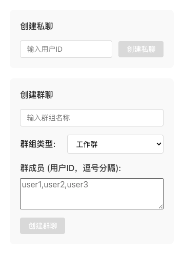 <template><div class="conversation-creator"><div class="create-c2c"><h4>创建私聊</h4><div class="form-group"><inputv-model="userID"type="text"placeholder="输入用户ID"@keyup.enter="handleCreateC2C"/><button @click="handleCreateC2C" :disabled="!userID.trim()">创建私聊</button></div></div><div class="create-group"><h4>创建群聊</h4><div class="form-group"><inputv-model="groupName"type="text"placeholder="输入群组名称"/></div><div class="form-group"><label>群组类型:</label><select v-model="groupType"><option value="Work">工作群</option><option value="Public">公开群</option><option value="Meeting">会议群</option></select></div><div class="member-selector"><label>群成员 (用户ID,逗号分隔):</label><textareav-model="memberList"placeholder="user1,user2,user3"rows="3"></textarea></div><button@click="handleCreateGroup":disabled="!groupName.trim() || !memberList.trim()">创建群聊</button></div></div></template><script setup lang="ts">import { ref } from 'vue';import { useConversationListState } from '@tencentcloud/chat-uikit-vue3';import type { CreateGroupParams } from '@tencentcloud/chat-uikit-engine';const {createC2CConversation,createGroupConversation,setActiveConversation} = useConversationListState();const userID = ref('');const groupName = ref('');const groupType = ref<'Work' | 'Public' | 'Meeting'>('Work');const memberList = ref('');const handleCreateC2C = async () => {if (!userID.value.trim()) {alert('请输入用户ID');return;}try {const conversation = await createC2CConversation(userID.value);setActiveConversation(conversation.conversationID);console.log('私聊创建成功:', conversation.conversationID);userID.value = '';} catch (error) {console.error('创建私聊失败:', error);alert('创建私聊失败,请检查用户ID是否正确');}};const handleCreateGroup = async () => {if (!groupName.value.trim()) {alert('请输入群组名称');return;}if (!memberList.value.trim()) {alert('请输入群成员');return;}try {const members = memberList.value.split(',').map(id => id.trim()).filter(id => id).map(userID => ({ userID }));if (members.length === 0) {alert('请输入有效的群成员ID');return;}const groupParams: CreateGroupParams = {name: groupName.value,memberList: members,type: groupType.value,};const conversation = await createGroupConversation(groupParams);setActiveConversation(conversation.conversationID);console.log('群聊创建成功:', conversation.conversationID);// 重置表单groupName.value = '';memberList.value = '';groupType.value = 'Work';} catch (error) {console.error('创建群聊失败:', error);alert('创建群聊失败,请检查参数是否正确');}};</script><style scoped>.conversation-creator {padding: 20px;max-width: 500px;}.create-c2c, .create-group {background: #f9f9f9;border-radius: 8px;padding: 20px;margin-bottom: 20px;}.create-c2c h4, .create-group h4 {margin: 0 0 16px 0;color: #333;}.form-group {display: flex;gap: 12px;margin-bottom: 16px;align-items: center;}.form-group:last-child {margin-bottom: 0;}.form-group label {min-width: 80px;font-weight: 500;}.form-group input,.form-group select,.form-group textarea {flex: 1;padding: 8px 12px;border: 1px solid #d9d9d9;border-radius: 4px;font-size: 14px;}.form-group textarea {resize: vertical;font-family: inherit;}.member-selector {display: flex;flex-direction: column;gap: 8px;margin-bottom: 16px;}.member-selector label {font-weight: 500;color: #333;}button {padding: 8px 16px;background: #1890ff;color: white;border: none;border-radius: 4px;cursor: pointer;font-size: 14px;transition: background-color 0.2s;}button:hover:not(:disabled) {background: #40a9ff;}button:disabled {background: #d9d9d9;cursor: not-allowed;}</style>