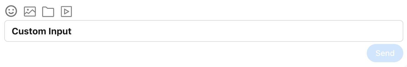 <template><MessageInput :actions="customActions" /></template><script lang="ts" setup>import { MessageInput } from '@tencentcloud/chat-uikit-vue3';// 自定义按钮顺序:文件、图片、视频、语音通话、视频通话const customActions = ['FilePicker', 'ImagePicker', 'VideoPicker', 'AudioCallPicker', 'VideoCallPicker'];</script>