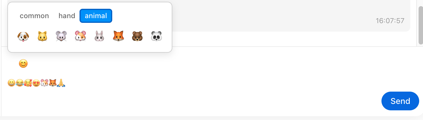 <template><MessageInput :actions="actions" /></template><script lang="ts" setup>import { defineComponent, h, ref } from 'vue';import { MessageInput, useMessageInputState } from '@tencentcloud/chat-uikit-vue3';const actions = [{key: 'EmojiPicker',component: CustomEmojiPicker,}];const CustomEmojiPicker = defineComponent({name: 'CustomEmojiPicker',setup() {const { insertContent } = useMessageInputState();const showPicker = ref(false);const activeCategory = ref('common');const emojiCategories = {'common': ['😀', '😂', '🥰', '😍', '🤔', '😭', '😡', '👍'],'hand': ['👋', '🤝', '👏', '🙏', '✌️', '🤞', '🤟', '👌'],'animal': ['🐶', '🐱', '🐭', '🐹', '🐰', '🦊', '🐻', '🐼'],};const insertEmoji = (emoji: string) => {insertContent(emoji);showPicker.value = false;};return () =>h('div', { style: { position: 'relative' } }, [h('button',{onClick: () => (showPicker.value = !showPicker.value),style: { border: 'none', background: 'transparent', cursor: 'pointer' },},'😊',),showPicker.value &&h('div',{style: {position: 'absolute',bottom: '100%',left: 0,background: 'white',border: '1px solid #ccc',borderRadius: '8px',padding: '12px',width: '280px',boxShadow: '0 4px 12px rgba(0,0,0,0.1)',zIndex: 100, // Ensure it's above other elements},},[// 分类标签h('div', { style: { display: 'flex', marginBottom: '8px' } },Object.keys(emojiCategories).map((category) =>h('button',{key: category,onClick: () => (activeCategory.value = category),style: {padding: '4px 8px',border: 'none',background: activeCategory.value === category ? '#1890ff' : 'transparent',color: activeCategory.value === category ? 'white' : '#666',borderRadius: '4px',cursor: 'pointer',fontSize: '12px',},},category,),),),// 表情网格h('div',{style: {display: 'grid',gridTemplateColumns: 'repeat(8, 1fr)',gap: '4px',},},emojiCategories[activeCategory.value].map((emoji) =>h('button',{key: emoji,onClick: () => insertEmoji(emoji),style: {border: 'none',background: 'transparent',fontSize: '20px',cursor: 'pointer',padding: '4px',borderRadius: '4px',},},emoji,),),),],),]);},});</script>