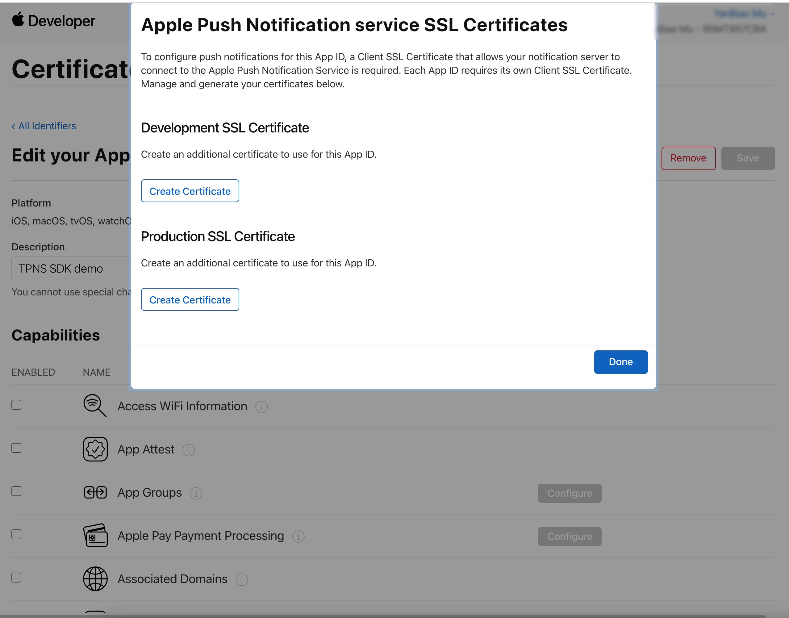 ,分别用于开发环境(Development)和生产环境(Production)的远程推送证书,如下图所示: